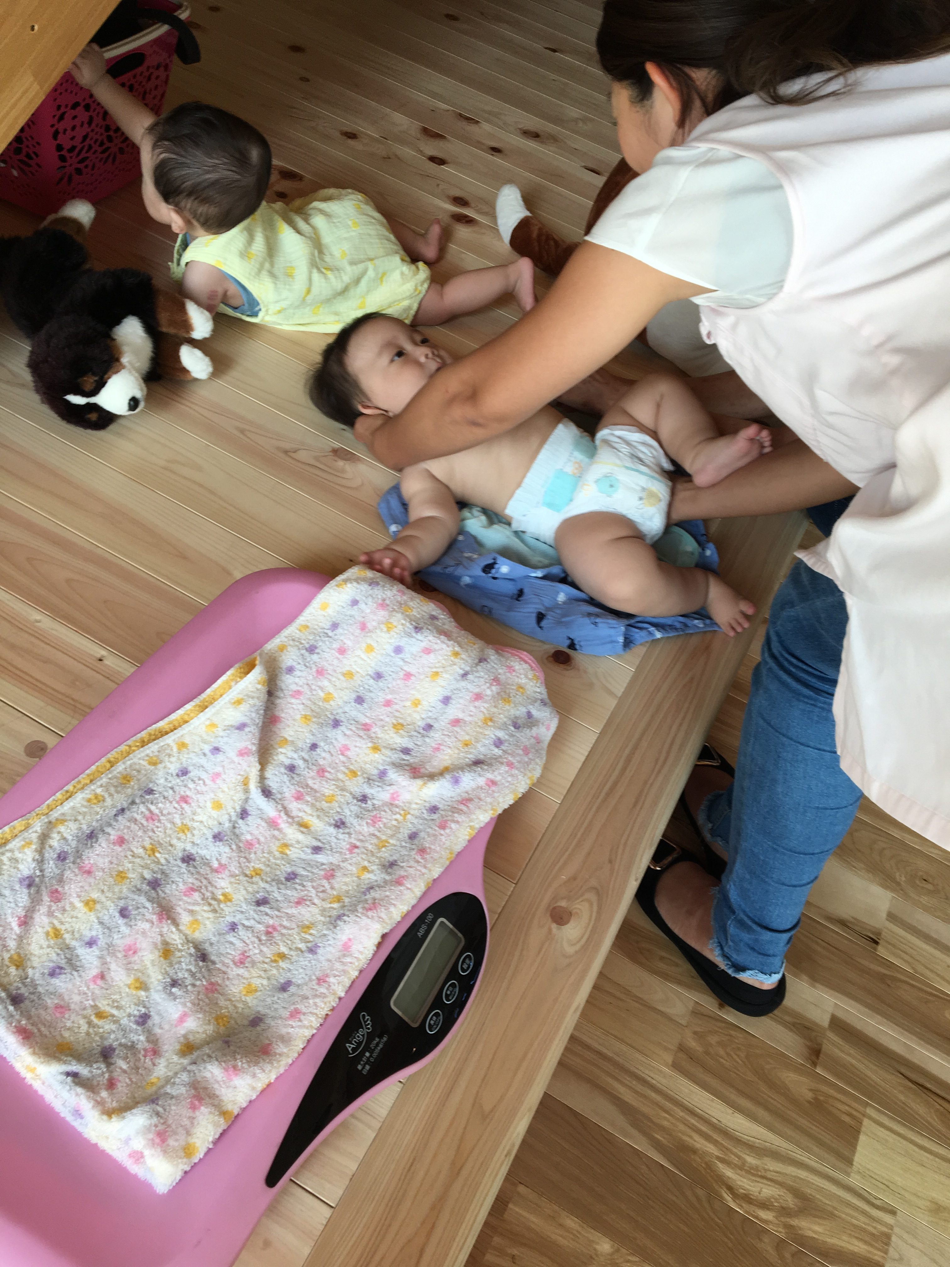 助産師さんに体重測定をしてもらえます。ミルクやおっぱいの量が足りてるかな??